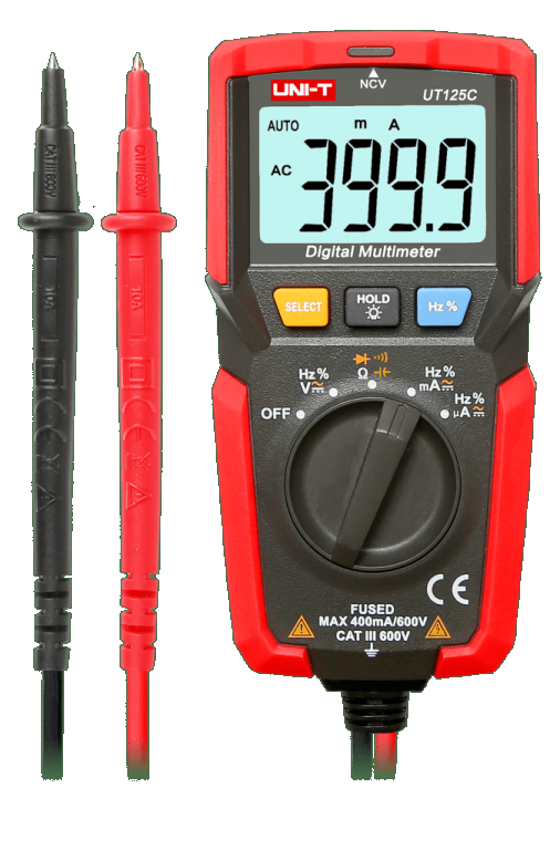 UT125C is a pocket size, ergonomic and reliable multimeter with 4000 display counts. It is a useful tool for electronics DIYers working with low currents (< 0.4A). This product is CE/ETL certified and complies with CAT III 600V.